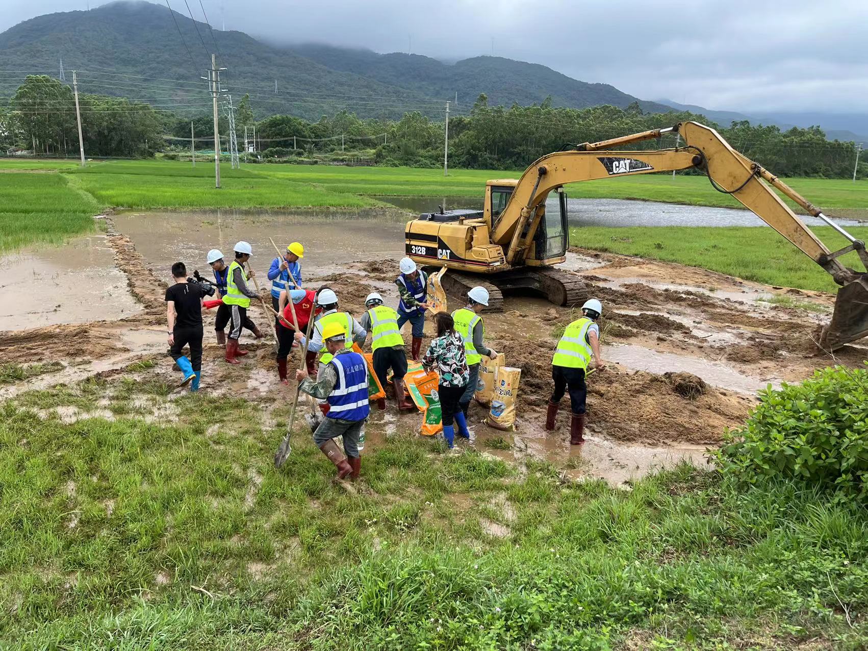在溪头镇双水村委会下垌仔村,记者看到,该河道的堤围已经被冲开了缺口,原已种上水稻的部分农田被河水及泥沙覆盖,受灾较为严重。双水村委会干部以及广东新江永安建设集团有限公司、广东汇晟建设有限公司的员工在现场参与抢险救灾,他们扛起沙包封堵堤围缺口,利用挖掘机疏通河道,尽力恢复农田原貌。